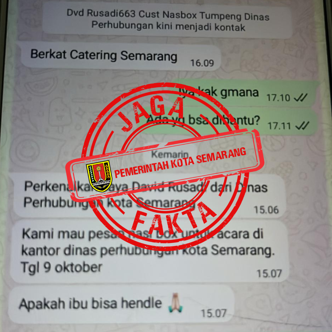 Beredar pesan WhatsApp dari nomor tidak dikenal yang mengatasnamakan pegawai Dinas Perhubungan (Dishub) Kota Semarang. Dalam pesan tersebut, pelaku memperkenalkan diri dari Dinas Perhubungan Kota Semarang mengaku ingin memesan nasi box untuk acara di kantor Dishub pada tanggal tertentu.
